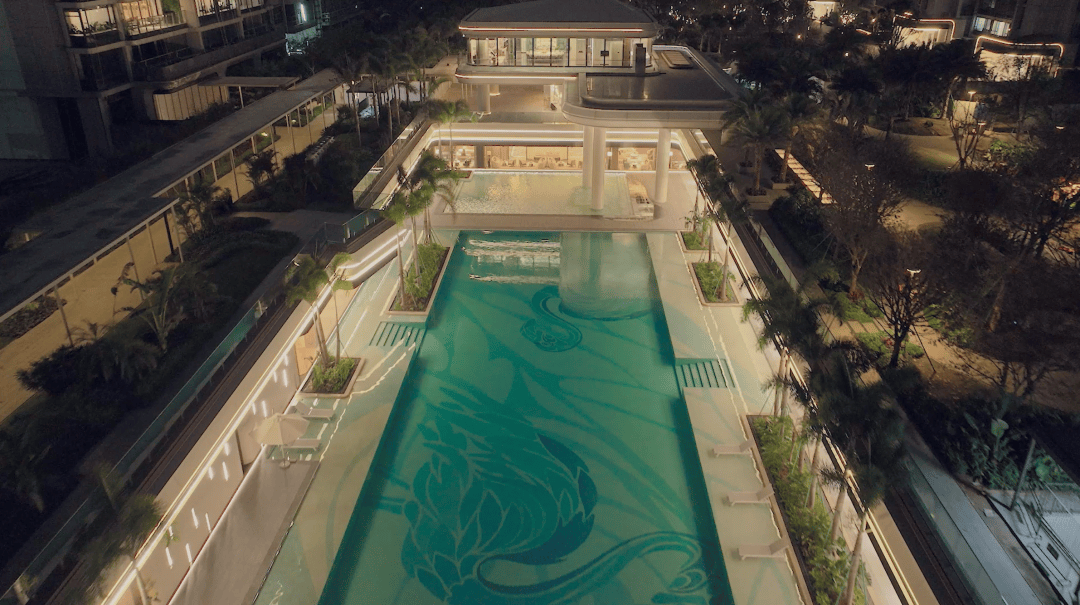 如果站在私宴厅旁边巨大的观景露台上远眺,你能够把半个中轴园林与下沉式泳池,尽收眼底。