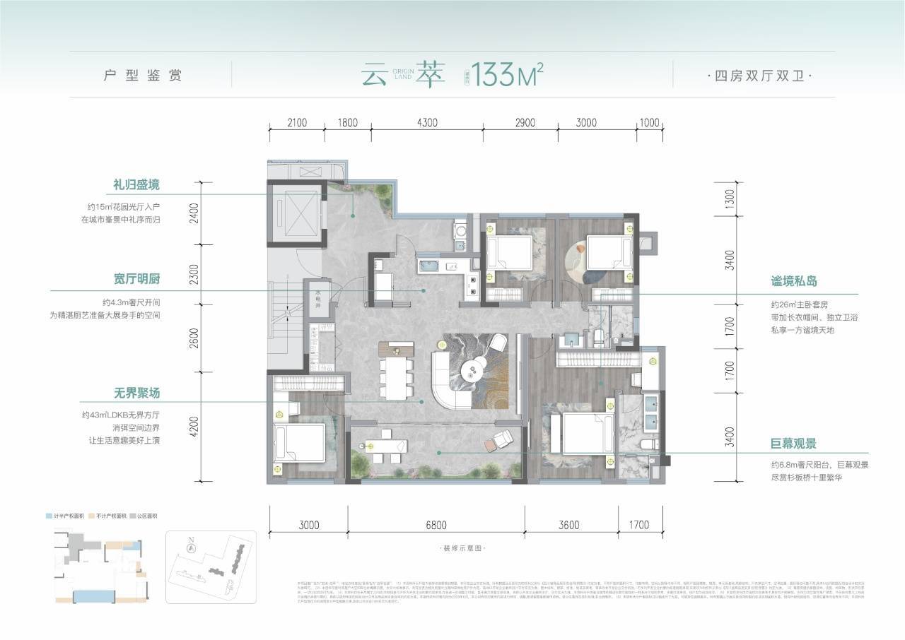 超阔空间:建面约112㎡享超配4房大方厅,采用LDKB一体化设计,消弭空间界限,演绎生活丰盈场景,巧妙打通书房空间,双阳台对望室内更加通透;建面约133㎡享4房大双厅奢阔主卧,幻变空间可做书房、棋牌室,满足家庭全生命周期情景所需。