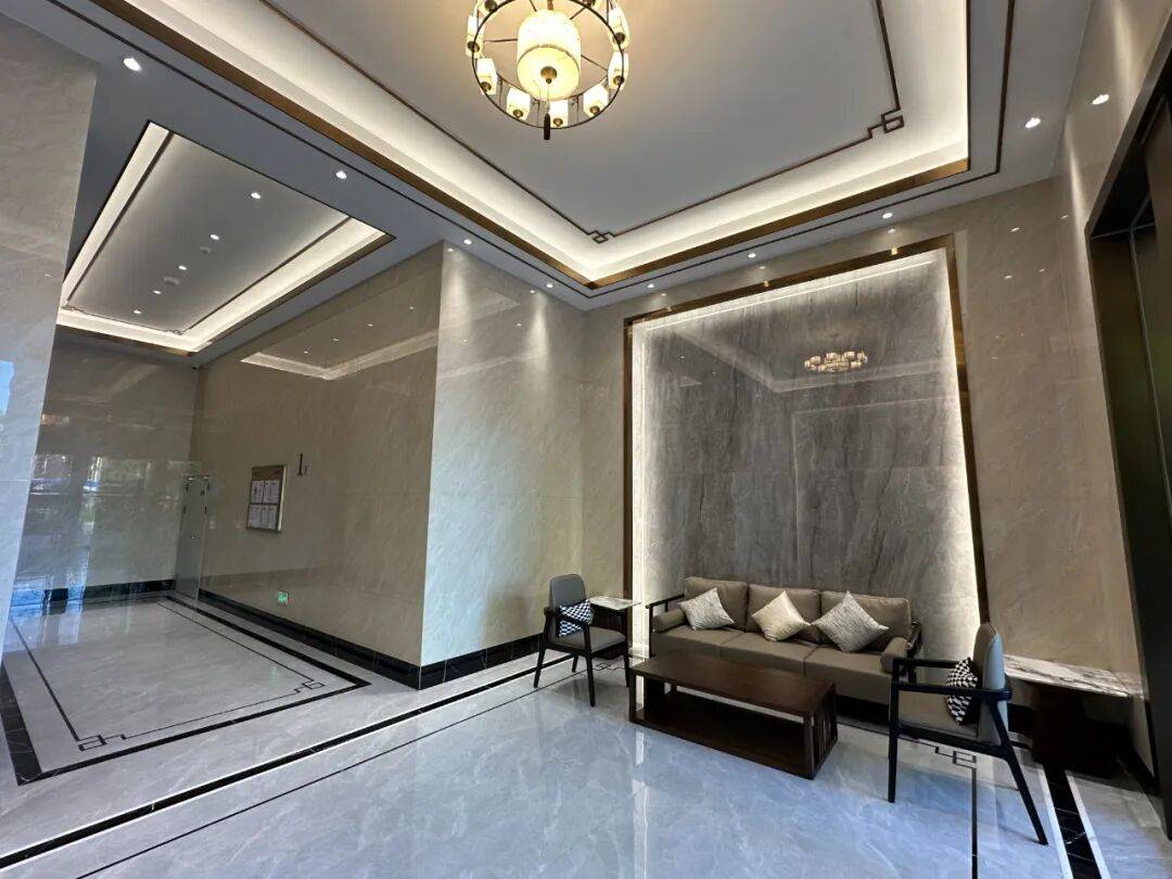星级酒店式入户大堂层高达到5.4米(每栋层高不同),墙面贴砖到顶、大理石背景墙,中式吊顶采用金属条压边,呈现高端大气奢华。