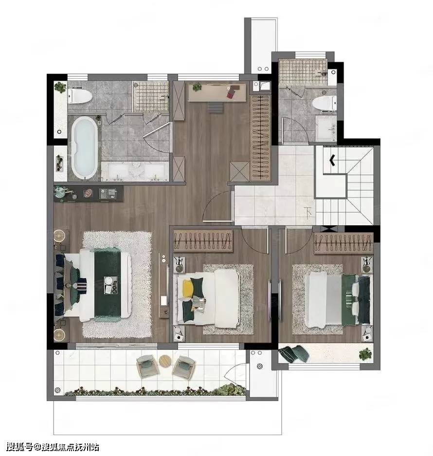在房间功能排布上,主卧套房设计,增加了主人居住的尊崇感与私密感;次卧旁设置外卫,