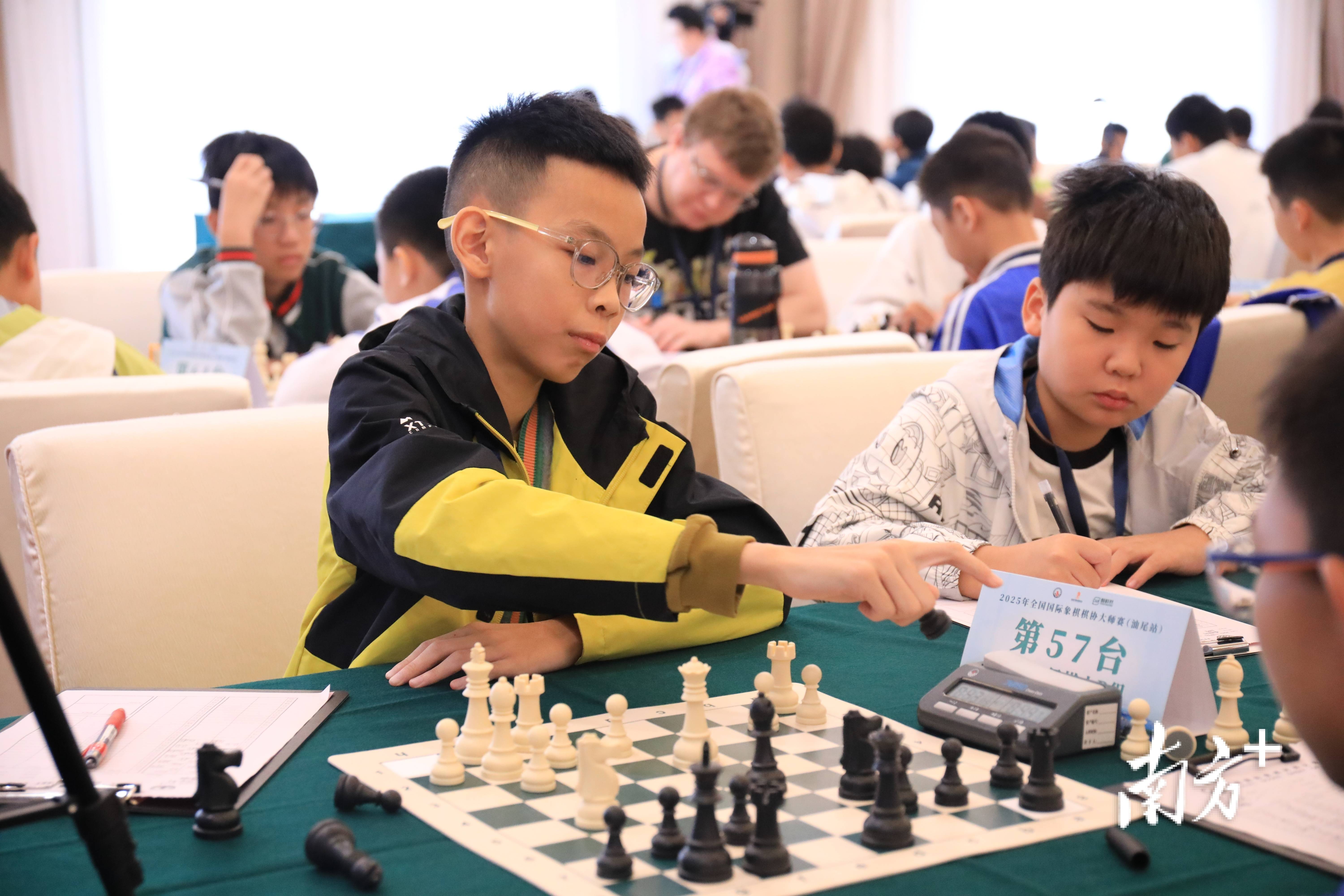 有的小棋手眉头紧锁,紧盯棋盘,小小的手掌托着腮帮,陷入沉思;有的则气定神闲,果断出手,尽显大将风范。