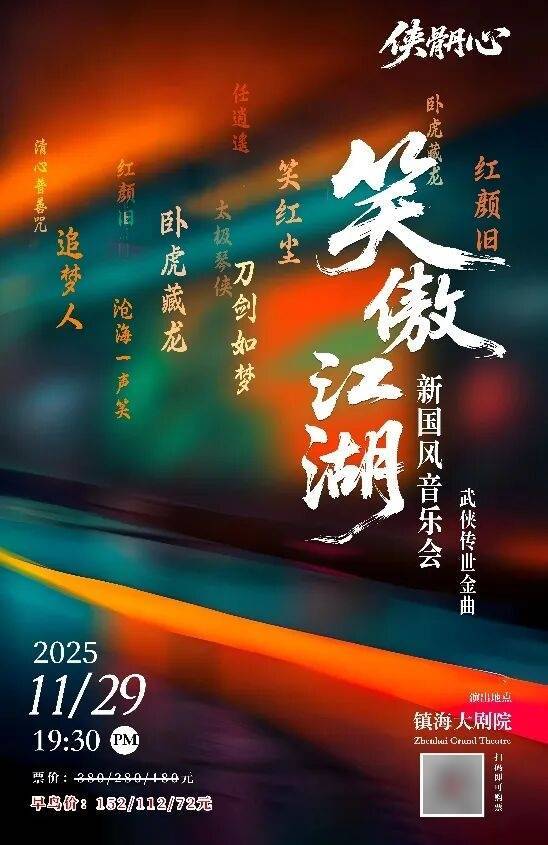 简介:以音乐重燃武侠梦,以热血致敬江湖情,是否还记得那些年我们追过的江湖?郭靖黄蓉的肝胆相照,杨过小龙女的十六年之约,张无忌的光明顶之战,乔峰的豪情万丈……每一段旋律,都是一把钥匙,开启我们深藏心底的武侠梦,我们以国乐为媒,以电声为翼,邀您踏入一场跨越时空的音乐江湖!(关注“镇海大剧院”公众号购票)