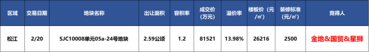今年2月,上海2025一批次土拍中,国贸、金地、星狮联合体以8.1521亿元竞得松江SJC10008单元05a-24号地块,溢价率13.98%,成交楼面价26216元/m²,装修标准不小于2500元/㎡.