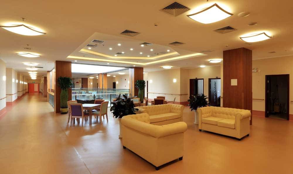 为了满足不同老人的需求,公寓在设施建设上投入巨大,打造了完备的配套设施。公寓总占地面积18000平米,建筑面积21000平方米,其中7000平方米的园林景观区,绿植葱郁、景致优美,设有休闲座椅、观景小径、健身区域等,老人闲暇时可在此散步、聊天、健身,感受自然之美,舒缓身心。主体建筑采用“回”字形设计,蕴含“天人合一”的传统理念,融合古典与现代建筑风格,整体环境赏心悦目,既有着传统建筑的雅致,又有着现代建筑的便捷,为老人营造了温馨舒适的居住氛围。