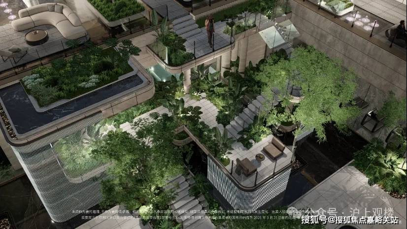 运用室内手法室外化设计构想,将垂直景墙、悬浮观景台与叠水景观立体穿插,形成情随境转的沉浸式体验,自然元素渗透进室内,并与室内空间动态互动。