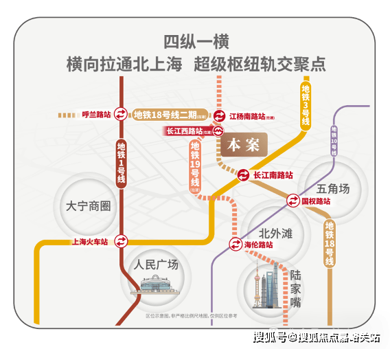 地铁18号线横向拉通了原本纵向不相连的四线,将北上海横向联通,成为区域轨交的交汇聚点;项目紧邻长江西路地铁站(直线站五角场。